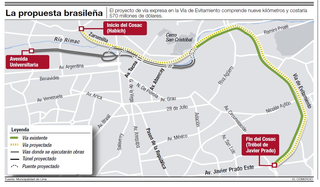 Tres años se necesitarán para la conclusión de los trabajos, luego de lo cual se tomarán dos años más para la ejecución de segunda etapa. En ésta se construirán en la Vía de Evitamiento un total de 16 kilómetros de carriles para el Corredor Segregado de Alta capacidad (Cosac) IV, entre las avenidas Habich y Javier Prado, con unas 30 estaciones de pasajeros.